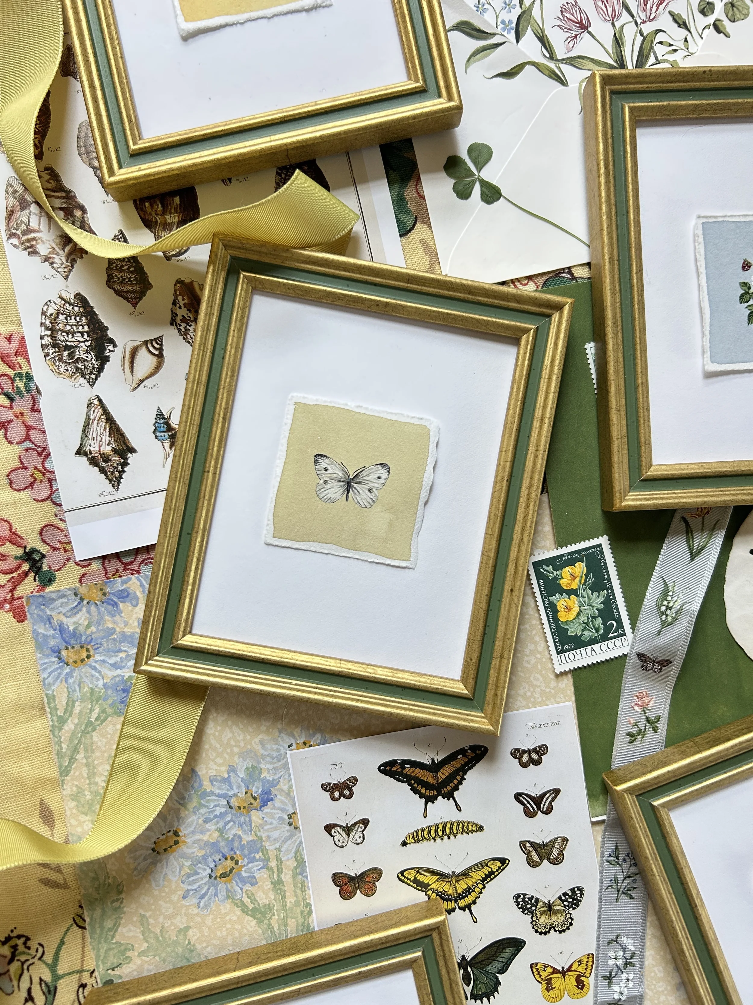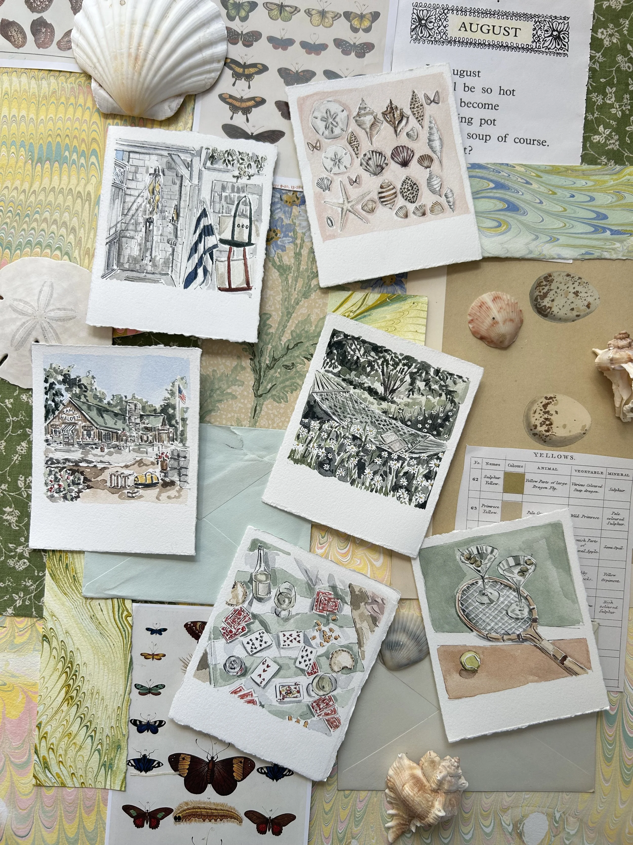 The “Out of Studio” collection is, simply put, inspired by time spent out of office- think outdoor showers, playing cards on the back of a boogie board, piles of flip flops on sand dunes, wet swimsuits hanging on a line, PBJ sandwiches on the beach, etc. While in Michigan, I painted some summer “souvenirs” to add to the series- flowers, seashells, fruits, and butterflies “collected,” or photographed, over the summer, between trips to the farmer’s market, the beach, and the apple orchard.